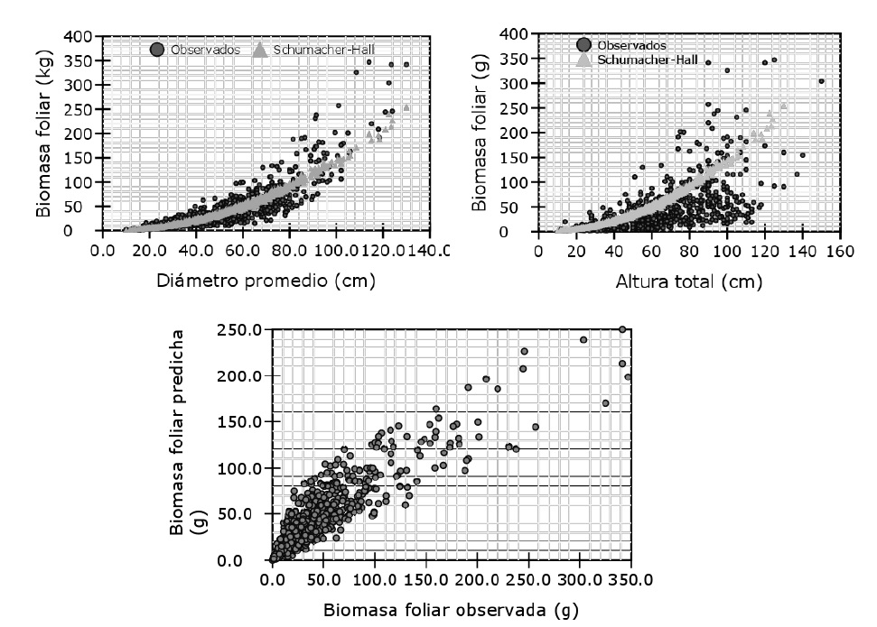 The Schumacher-Hall model is applicable for these conditions and study sites; this type of model has been used to predict the timber volume of temperate species, as well as their total biomass and components (Velasco et al., 2007; Ramos-Uvilla et al., 2014), while the potency model has been used in Acacia pennatula and Guazuma ulmiflora to predict the forage biomass and fuelwood production, considering the mean basal diameter as a variable (López-Merlín et al., 2003).
