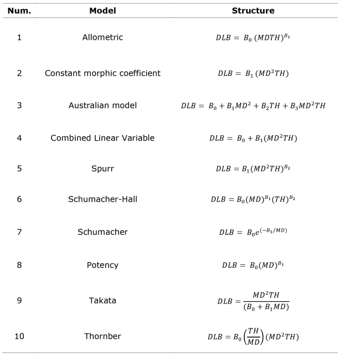 The Schumacher-Hall model is the one that best predicts the dry leaf biomass (DLB) of the standing oregano shrubs and can be used to calculate the usable biomass in the oregano plots of southeastern Coahuila.