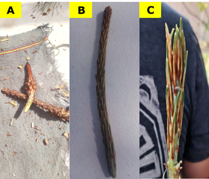 On April 29th, 2023, shoots from the last growth cycle of 12 superior trees were collected, based on their growth and conformation, located in Chignahuapan and Ixtacamaxtitlán, Puebla. The selected trees had dominant height (18 to 26 m) and diameter (19 to 25 cm), straight stem, branch insertion at an angle close to 90° and good natural pruning. In each provenance, six trees were selected: two with dormant buds, two at the beginning of bud growth and two with buds in full growth. The phenological stages were defined based on the growth characteristics of the buds; scions in dormancy were those in which no bud elongation was observed (Figure 1A), while growing scions showed initial elongation (start of growth) (Figure 1B) and bud development (full growth) (Figure 1C).