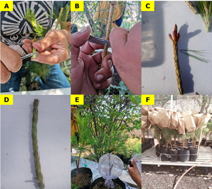 The grafts were carried out on April 30th, 2023 in the nursery of the Posgrado en Ciencias Forestales del Colegio de Postgraduados (Graduate Program in Forest Sciences of the Graduate Studies College) in the Montecillo Campus, Texcoco, Mexico. The rootstocks were 18 months old and their average height and diameter at the root neck were 70 and 1.5 cm, respectively. The side veneer graft technique described by Pérez-Luna et al. (2019) was followed. The scion was prepared by two parallel tangential cuts of 5 and 1 cm in length each (Figure 2A). A 4 cm long tangential cut was made in the pattern with a slight 1 cm deep indentation (Figure 2B) to achieve an adequate fit of the graft, which was fixed with 4 mm caliber glass rubber. Two types of twigs were used for grafting: scions with terminal bud (Figure 2C) and basal scions (section of the base of the twig collected in the field, generally discarded in grafting activities) (Figure 2D). The graft was covered with a 0.75 L transparent plastic bag, with disinfectant based on quaternary ammonium salts (10 mL L-1 of water) applied by atomization to generate a microclimate of high relative humidity (Figure 2E), which was covered with a Kraft paper bag to protect the graft from solar radiation and prevent dehydration (Figure 2F).