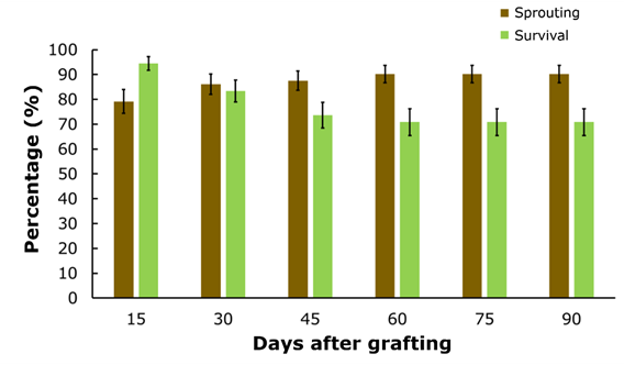 Figure 3 Average graft sprouting and survival by evaluation period (days after grafting).