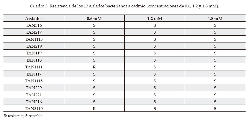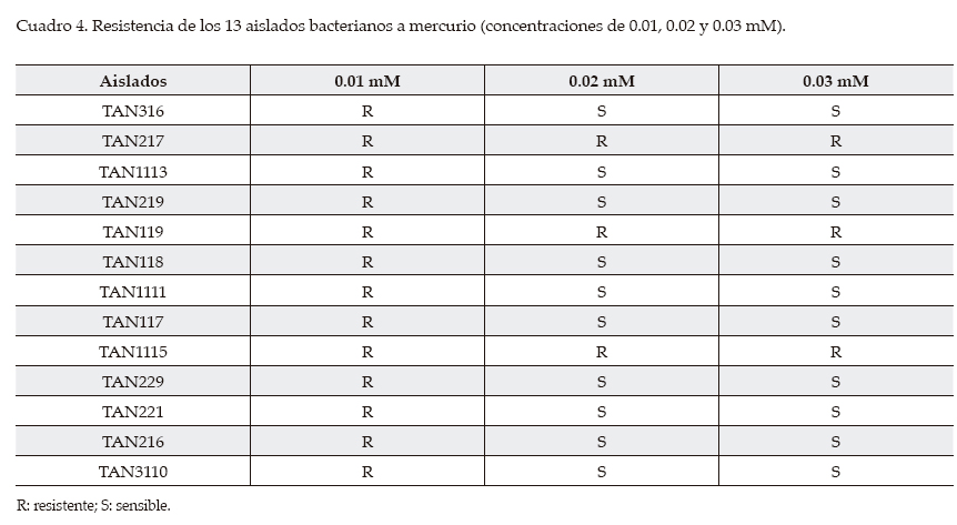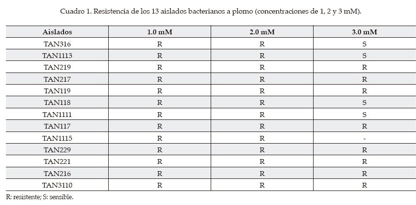 Han sido informadas numerosas bacterias resistentes a metales tanto aisladas de suelos y aguas como de sedimentos. En la mayoría de las investigaciones, las concentraciones de metales estudiadas son menores que las ensayadas en esta investigación (Filali et al., 2000; Vullo et al., 2005) y en otros son similares a las del presente estudio (De Souza et al., 2006). Por tal motivo, los aislados obtenidos representan microorganismos interesantes, al poder resistir concentraciones elevadas y superiores a lo encontrado en la mayoría de los informes.