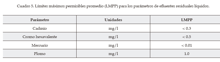 Las concentraciones de metales estudiadas se encuentran por encima de los Límites Máximos Permisibles Promedio (LMPP) para los parámetros de los residuales líquidos, según la Norma Cubana NC 27-1999 (ver cuadro 5).