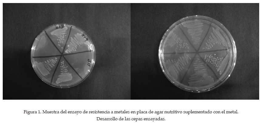 Se partió de un pre-inóculo preparado en caldo nutritivo con un desarrollo de 24 horas y se realizó la siembra por estría de cada aislado con su réplica en medio agar nutritivo suplementado con el metal. Como control de la proliferación de las cepas, se empleó el medio agar nutritivo sin los metales, donde se inoculó cada una, para verificar su correcto desarrollo en ausencia de los metales. Como controles para la verificación de la esterilidad de los medios, se empleó agar nutriente con cada concentración para cada metal sin inocular, y como controles del desarrollo a los correspondientes niveles de metales, se emplearon cepas bacterianas caracterizadas en cuanto a su resistencia a metales, pertenecientes al cepario de la Facultad de Biología, Universidad de La Habana, Cuba.