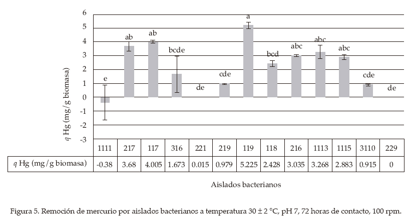 Para el plomo (figura 2), el aislado TAN1111 resultó ser el mejor de todos, dando un valor de remoción desde el punto de vista estadístico significativamente superior a los valores de remoción del resto. Para el cromo (figura 3), TAN1113 y TAN1115, a pesar de haber sido los únicos que presentaron remoción, presentan la diferencia de que TAN1113 es el único cuyo valor es estadísticamente significativo con respecto del resto (a), no presentando relación, pues en el caso de TAN1115 presenta una media corrompida (ab). Para el mercurio (figura 5), los aislados TAN 119, TAN117, TAN217, TAN1113, TAN 216 y TAN1115 mostraron los valores más altos, pero TAN119 fue el único que reveló una diferencia significativa total con el resto de los aislados (a). Hay que resaltar que los aislados TAN1113 y TAN1115 se repiten con buenos resultados frente al mercurio, pues ya se habían visto buenos resultados con el cromo.