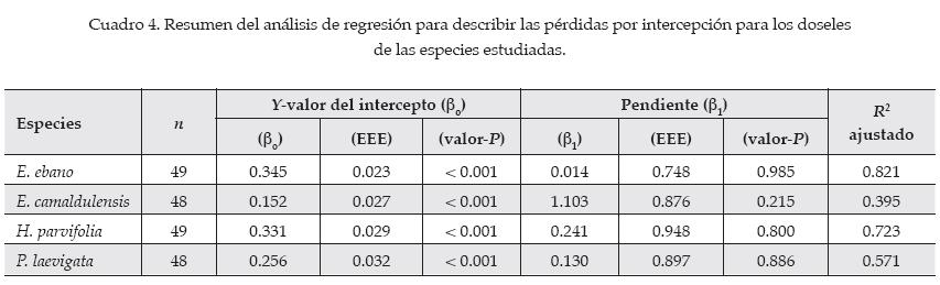 Los resultados de los análisis de regresión de la intercepción se muestran en el cuadro 4, donde los rangos del coeficiente de determinación obtenidos del análisis de regresión entre la precipitación incidente y la intercepción fluctuaron entre r2 = 0.40 para E. camaldulensis hasta valores de 0.82 en E. ebano, la cual presentó un mayor porcentaje de pérdidas por intercepción. Estos valores indican que otros factores están influyendo en las pérdidas por intercepción, tales como intensidad de lluvia, velocidad del viento, eventos diurnos o nocturnos y evapotranspiración, entre otras variables que deben ser tomadas en cuenta en un análisis de regresión múltiple. Así también, E. camaldulensis es la especie de mayor altura y con un dosel medio, la cual presentó los valores más bajos de intercepción. El análisis individual de las precipitaciones ocurridas mostró que la lluvia que llega al suelo no es una fracción constante de la lluvia total, sino que las lluvias incipientes tienden a ser más interceptadas (figura 5).