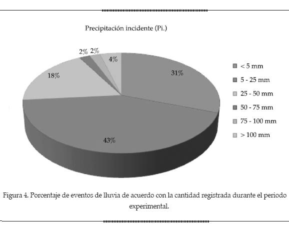 El análisis de 49 eventos de lluvia acumuló un total de 978.77 mm registrados durante año y medio de estudio de campo. El comportamiento de las precipitaciones acumuladas mensualmente mostró la presencia de un mayor número de eventos de precipitaciones y más cantidad de milímetros de lluvia en los meses de septiembre de 2009 y abril de 2010, tal como se reporta en la temporada de lluvias en el sitio de estudio. El rango de lluvias individuales fluctuó de 0.47 a 115.34 mm, donde el 31% de las precipitaciones registradas fue menor a 5 mm; la mayor cantidad de eventos está comprendida entre 5 y 25 mm, con un 43%; las lluvias con cantidades entre 25 y 50 mm representaron el 18% del total; mientras que para el rango comprendido entre 50 y 75 mm, así como entre 75 y 100 mm, fue de 2%; los eventos mayores a 100 mm representaron el 4% del total de las precipitaciones (figura 4).