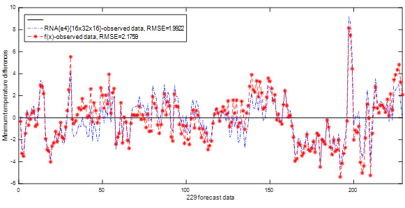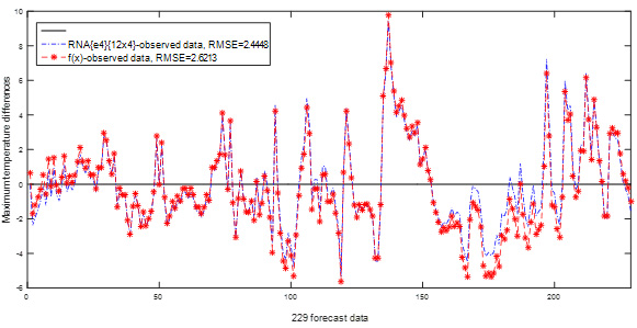 Figure 1 Differences between the RNA and Fourier series models with the observed maximum temperature data for Santa Rosa I AC; Fourier model with n = 5: f(x) = 31.86 - 0.6201 cos(0.01727x) + 5.871 sin (0.01727x) + 0.8935 cos(2*0.01727x) - 0.0709 sin(2*0.01727x) - 0.745 cos(3*0.01727x) + 0.6926 sin(3*0.01727x) + 0.3822 cos(4*0.01727x) + 0.1923 sin(4*0.01727x) - 0.227 cos(5*0.01727x) + 0.1547 sin (5*0.01727x).