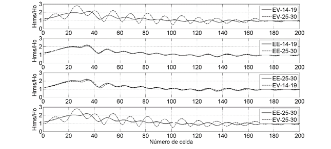El paso de tiempo de integración de las ecuaciones de gobierno del modelo fue de 0.001 s, y la adquisición de resultados fue de 100 Hz para homologar la frecuencia de registro de la superficie libre simulada con la obtenida en el EOFI-UNAM. El tiempo de simulación fue de 30 s para todos los experimentos. Con respecto al procesamiento de resultados numéricos, se siguió la misma metodología que para la modelación física. Primero se obtuvieron series temporales de la superficie libre en la misma posición y frecuencia de muestreo que los sensores de nivel utilizados en el EOFI-UNAM (Figura 2) y después se obtuvo la H rms y los espectros de energía.