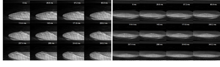 Además del registro de la superficie por los sensores de nivel, se realizó un registro del proceso de focalización por medio de una cámara de alta velocidad. La cámara fue instalada en dos posiciones, para registrar la vista lateral y frontal del proceso de focalización (Figura 5). El registro de video se realizó para una velocidad de 700 cuadros por segundo. La Figura 5 muestra un conjunto de fotogramas obtenidas a partir del video de alta velocidad para el caso de incidencia normal tanto en vista lateral (panel superior) como en vista frontal (panel inferior). Para el caso de vista lateral, el oleaje viaja de derecha a izquierda, alcanzando un máximo en la zona focal a los 143 ms. En la vista frontal se aprecia la vista transversal del lente y el oleaje se aproxima de atrás hacia adelante, alcanzando el máximo a los 143 ms.