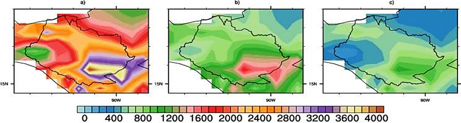 Figura 3 Climatología de la precipitación en las cuencas Grijalva y Usumacinta entre 1960 y 2016: a) anual; b) veraniego; y, c) invernal.