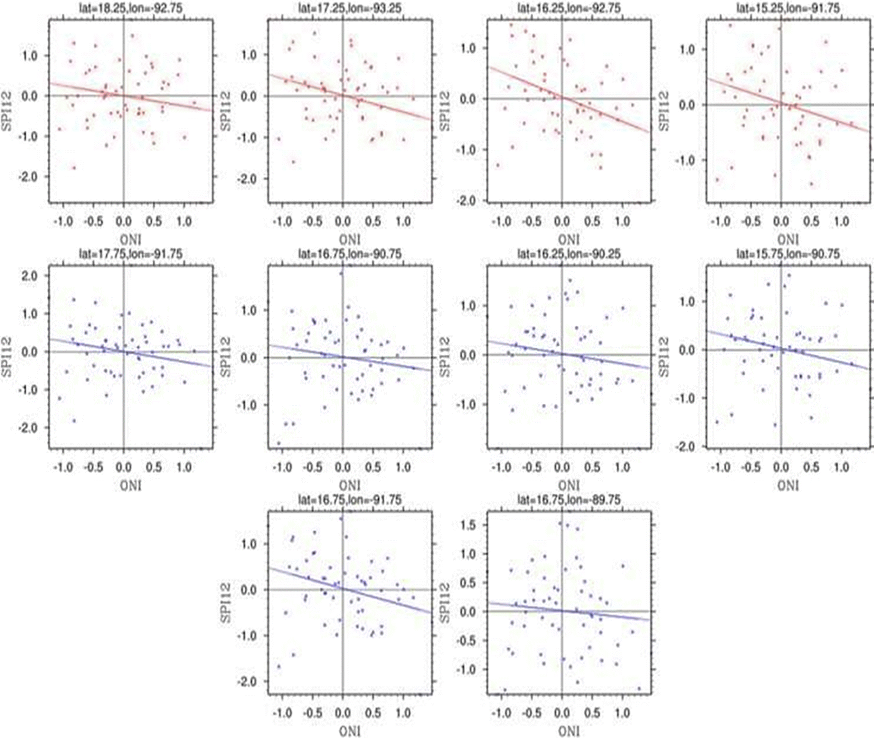 Figura 7 Relaciones entre el Índice Niño Oceánico (ONI) y el Índice Estandarizado de Precipitaciones a 12 meses (SPI-12) en cada punto de estudio de 1960 a 2016.