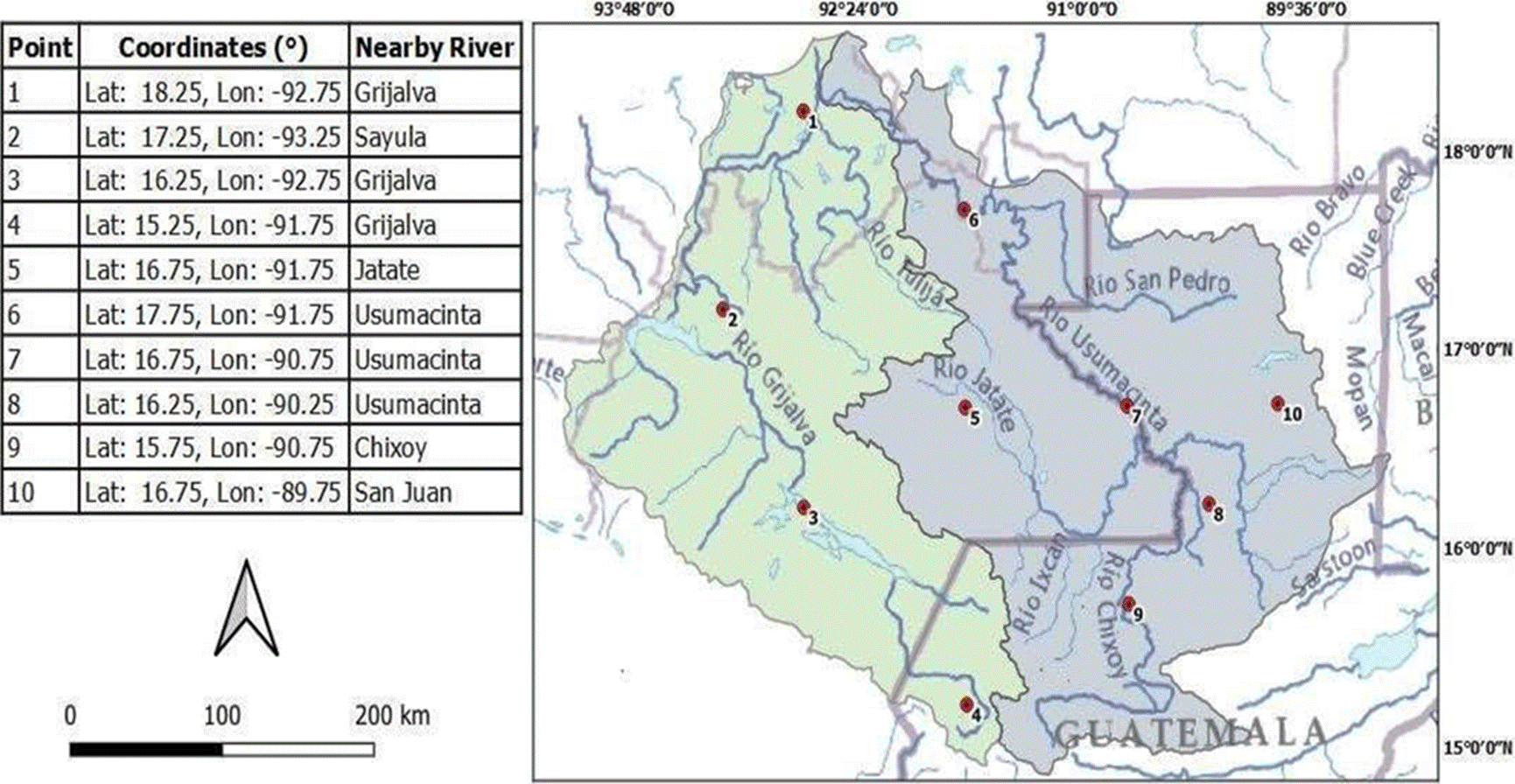 Figura 2 Ubicación de los sitios claves en las cuencas Grijalva y Usumacinta. (QGIS Desktop 3.10.0, World Hydro Basemap: HydroTeamRC).