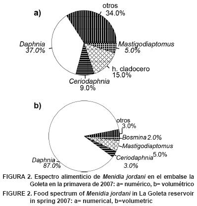 Al analizar los contenidos estomacales de Menidia jordani se encontraron los siguientes grupos: Cladoceros (Bosmina, Daphnia, Ceriodaphnia, Camptocercus, Diaphanosoma, Simocephalus, huevo de Cladócero, huevos de Moina, huevos de Bosmina, huevos de Daphnia, Moina), Copépodos (Mastigodiaptomus, Cyclops, Diaptomidae), Insectos (Trichoptera y Corixidae) y Crustáceos (Hyalella azteca). Los tres grupos más importantes de acuerdo al análisis numérico fueron: Daphnia (37 %), huevos de cladócero (15 %) y Ceriodaphnia (9 %). En el análisis volumétrico los tres grupos más importantes fueron: Dapnhia (87 %), Mastigodiaptomus (5 %) y Ceriodaphnia (3 %) (Figuras 2a y 2b).