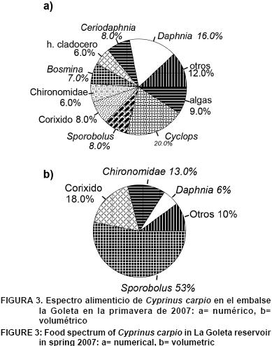 Los peces de embalse La Goleta se alimentan principalmente de zooplancton (Daphnia, Mastigodiaptomus y Ceriodaphnia) y de Sporobolus indicus.
