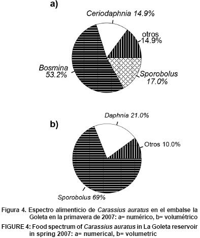 Por su espectro trófico (numérico), Carassius auratus presenta un consumo de zooplancton de 85 %, del cual 42 % pertenece a Daphnia, lo que concuerda con Korponai et al. (2003) quienes afirman que el género Carassius tiene afinidad alimenticia por Daphnia.