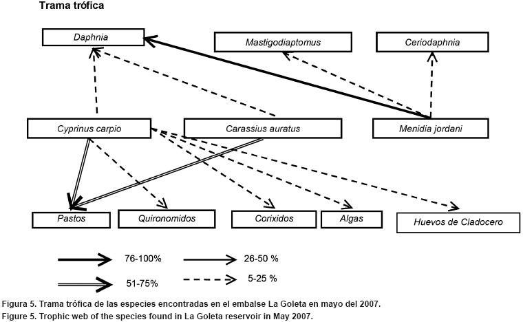 En la red trófica de la ictiofauna perteneciente al embalse La Goleta, se observa que la alimentación se basa en zooplancton y zoobentos, mostrando como grupo principal a Daphnia. Por otra parte, puede notarse que no sólo hay una inclinación por zooplancton (Daphnia, Mastigodiaptomus y Ceriodaphnia), sino también por Sporobolus indicus, lo cual puede deberse a que las áreas de Sporobolus indicus circundantes son una fuente importante de alimento directa e indirecta para carpas, según mencionan Chapman y Fernando (1994). La importancia de los crustáceos y vegetales en la dieta de los peces, ha sido registrada en el Golfo de Cariaco en Venezuela (Allen et al., 2006)