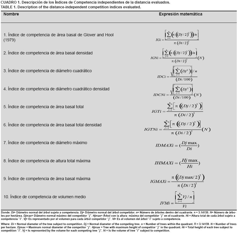 En la literatura se reporta una amplia variedad de índices de competencia dependientes de la distancia, desde los que consideran la superposición de zonas de influencia (Staebler, 1951; Gerrard, 1969; Bella, 1971; Arney, 1973; Ek y Monserud, 1974), hasta los índices basados en las dimensiones de los árboles vecinos ponderados por la distancia (Hegyi, 1974; Martin y Ek, 1984; Daniels, 1976; Biging y Dobbertin, 1992). Los índices independientes de la distancia son fáciles de calcular y demandan menor cantidad de información, lo cual representa una ventaja en algunos casos con respecto a los dependientes de distancia (Tomé y Burkhart, 1989). Glover y Hool (1979) desarrollaron un índice de competencia independiente de la distancia que considera simplemente las dimensiones del arbolado; tomando como base éste índice, se han desarrollado algunas ecuaciones que lo consideran en modelos que simulan el crecimiento en altura o en diámetro para una especie en particular (Valles et al., 1998; 2003).