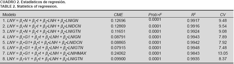 Para la selección de los mejores modelos matemáticos, fueron considerados los estadísticos: cuadrado medio del error (CME), coeficiente de determinación (R2), prueba de F y la prueba de hipótesis de los parámetros. Además, el nivel de exactitud de los parámetros y que no hubiera problemas con los signos de las estimaciones, de manera que sus valores reflejaran el efecto esperado de las variables independientes sobre la variable a explicar.
