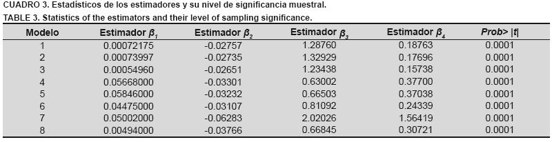 Con relación al resto de los modelos analizados en la presente investigación, no se hace referencia ya que aún y cuando presentaron un coeficiente de determinación igual o similar a los modelos presentados, el nivel de significancia de las estimaciones de sus parámetros fue menor.