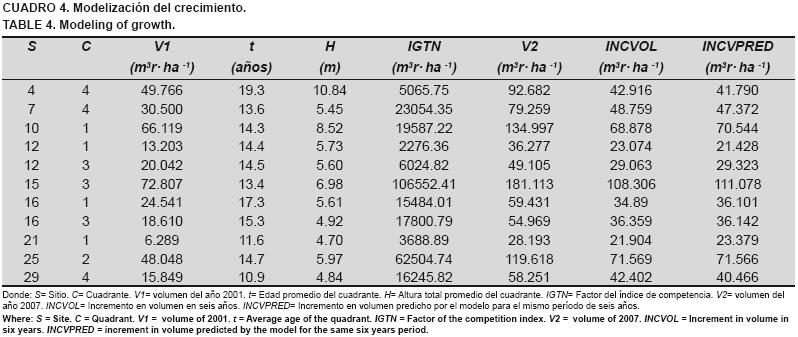 La modelización del crecimiento para los árboles presentes en un rodal, puede realizarse con el sistema de cómputo SAS®. A manera de ejemplo, se eligió el modelo logarítmico número 8, pudiéndose observar sus altos ajustes en el Cuadro 4; para obtener los resultados anteriores, se tomaron como datos base los obtenidos en el año 2001 (V1, t y H), además del valor del índice de competencia IGTN obtenido con esos mismos datos y los valores de los estimadores (P's) fueron tomados del Cuadro 3. El valor del V2 (volumen por hectárea del año 2007), sirvió de referencia para calcular el incremento en volumen durante ese período de seis años (INCVOL). En la columna marcada como INCVPRED, se relacionan los volúmenes predichos por el modelo. En general dichos volúmenes, tienen una ligera variación con respecto a los observados; sin embargo, esta situación se considera aceptable dentro de los parámetros estadísticos obtenidos en el análisis de varianza. De la misma forma como se mostró el funcionamiento del modelo seleccionado, se pueden reproducir los resultados del resto de los modelos obtenidos en la presente investigación.