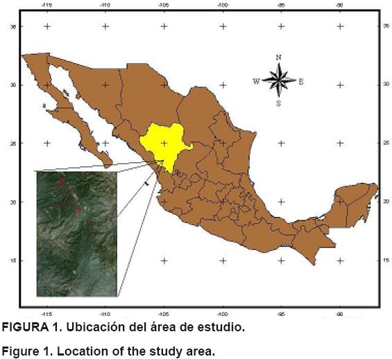 El área de estudio se ubica en el Ejido Pueblo Nuevo del estado de Durango, México, entre las coordenadas geográficas 23.60° y 23.41° de latitud norte, 105.38° y 105.40° de longitud oeste (Figura 1), en el macizo montañoso denominado Sierra Madre Occidental. Fisiográficamente se ubica en la subprovincia Gran Meseta y Cañones Duranguenses; la altura sobre el nivel del mar presenta un promedio de 2,130 m, con un sistema de relieve predominantemente accidentado y pocas superficies de terreno ondulado o plano. Según la clasificación climática de Köeppen adaptada para México por García (1973), los climas predominantes en la región son del tipo C(W2) y C(E) (W2), que corresponden respectivamente al templado subhúmedo y semifrío subhúmedo, con lluvias en verano, con precipitación del mes más seco menor de 40 mm y con un porcentaje de lluvia invernal entre 5 y 10.2 mm, temperaturas mínimas y máximas que pueden ser desde 18 hasta 32 °C. Las comunidades vegetales más importantes del predio están compuestas por bosques mezclados con especies del género Pinus y Quercus, además de algunas especies arbustivas. Las especies maderables que destacan para el aprovechamiento forestal son: Pinusherrerae, Pinus durangensis, Pinus douglasiana, Pinus lumholtzii, Pinus michoacana, Pinus leiophylla, Pinus oocarpa, Pinus ayacahuite, Pinus maximinoi, Pinus teocote, Pinus cooperi, Pinus engelmannii, Quercus spp., Juniperus spp., Arbutus spp., y Alnus spp., principalmente (Meraz, 2008).