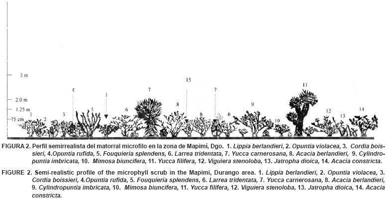 Para la caracterización de las asociaciones vegetales se recurrió a información bibliográfica, recorridos de campo para el reconocimiento de la vegetación y a la recolección de ejemplares botánicos en distintas asociaciones vegetales del desierto Chihuahuense. El criterio para la nomenclatura de los diferentes tipos de vegetación fue el fisonómico; en cada asociación se identificaron las especies dominantes y conspicuas. En cada sitio de muestreo se determinaron las variables ambientales: exposición, pendiente, altitud y características generales de cada tipo de suelo. Con los datos obtenidos se elaboraron diagramas de perfil semirrealista.