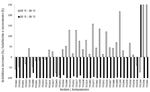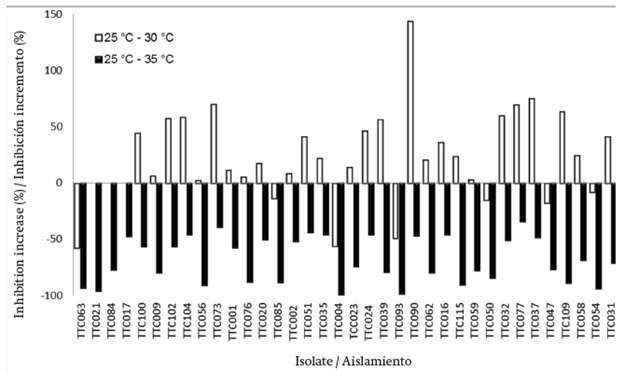 Figura 1 Cambios de inhibición o incremento del crecimiento micelial de los aislamientos nativos de Trichoderma al pasar de 25 a 30 °C y de 25 a 35 °C.