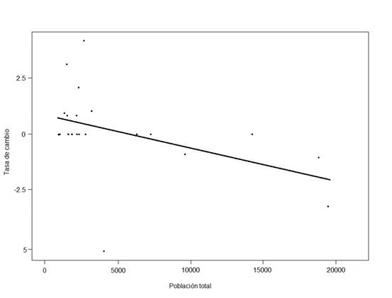 A pesar de que las tendencias socioeconómicas sostienen una relación lógica con la dinámica del CCUS, el modelo de regresión simple aplicado entre las tasas de cambio de los municipios de la RTC y las variables socioeconómicas, en ambos periodos, muestra que no existen factores únicos que expliquen los procesos del CCUS. No obstante, el modelo destaca una relación estadística negativa (R2 = 0.19; P = 0.039) entre la variable población total y la tasa de cambio del bosque de encino en los municipios de la RTC; es decir, mientras la población total es menor, las tasas de cambio son positivas, lo que representa una recuperación de la cobertura del bosque (Figura 6).
