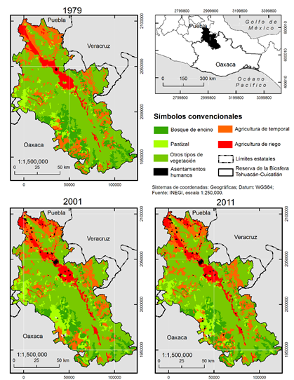 El objetivo de este estudio fue evaluar la dinámica regional de la deforestación y la recuperación, así como los factores del CCUS en el bosque de encino de la región Tehuacán-Cuicatlán, tanto en el polígono de la reserva como en su zona de influencia. La dinámica del CCUS se analizó en dos periodos: uno previo a la declaración oficial de la Reserva de la Biosfera Tehuacán-Cuicatlán (1979-2001) y otro posterior (2001-2011).