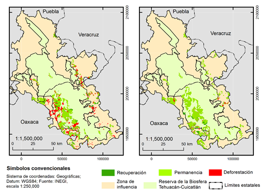 En el periodo previo al decreto de la Reserva de la Biosfera Tehuacán-Cuicatlán (RBTC) (1979-2001), el bosque de encino se deforestó. Las áreas de baja pendiente, la cercanía a localidades y una mayor población masculina fueron los principales conductores de tal cambio. En contraste, en el periodo posterior al decreto (2001-2011) resaltó la recuperación del bosque de encino promovida por factores como las áreas de pendiente y altitud elevadas y disminución de la población masculina. El decreto de la RBTC, ocurrido en 1998, no debe considerarse la causa principal de la contención de la deforestación del bosque de encino ni de su posterior recuperación incipiente; sin embargo, debe aceptarse injerencia indirecta, particularmente sobre la disminución de la población masculina, grupo social que tradicionalmente ha sido promotor de las actividades agropecuarias, del cambio de uso del suelo y de la deforestación.