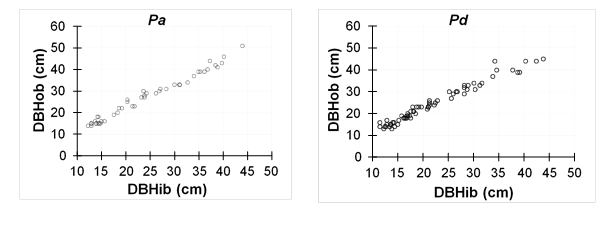 Figura 2 Diámetro normal con corteza (DBHob) y sin corteza (DBHib) en la sección transversal de 1.3 m en Pinus arizonica (Pa) y Pinus durangensis (Pd).