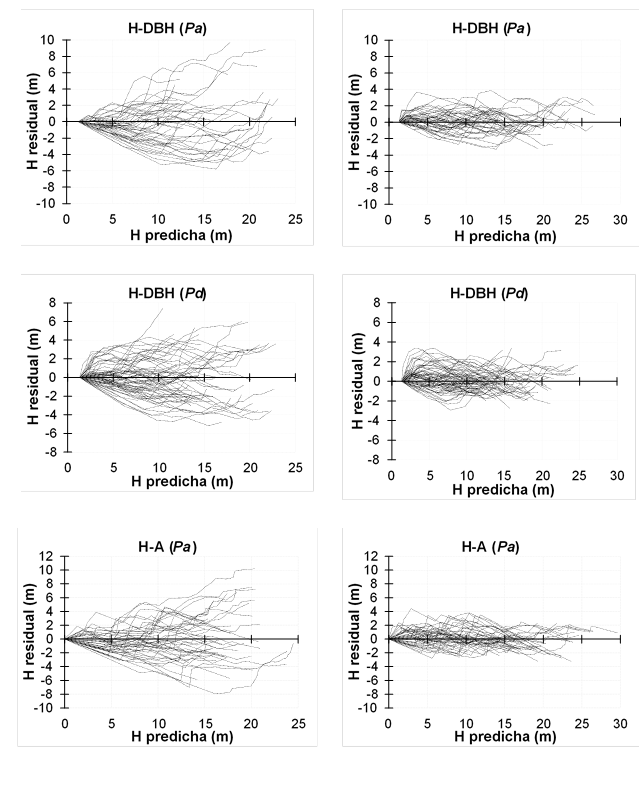 Los valores residuales y predichos para las ecuaciones de predicción y proyección en las relaciones H-DBH, H-A y DBH-A se representan en las Figuras 4 y 5. En todos los casos, las gráficas mostraron las trayectorias de los residuales para las series de crecimiento de cada árbol.