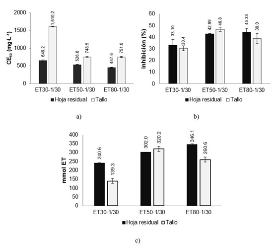 Con respecto a la capacidad antioxidante en la evaluación con el radical DPPH, los extractos de hojas tuvieron mayor inhibición que los extractos de tallos. La Figura 2a muestra los resultados CE50, que corresponde a la concentración efectiva de extracto para inhibir 50 % del radical; la concentración menor del extracto (mg∙L-1) indica que la actividad es mayor. La mayor capacidad se obtuvo en las muestras de hojas con ET80 (447 mg∙L-1 de extracto) y en tallos con ET50 (748 mg∙L-1 de extracto), aunque sin diferencia estadística (P > 0.05) para tallos con ET80 (750 mg∙L-1).
