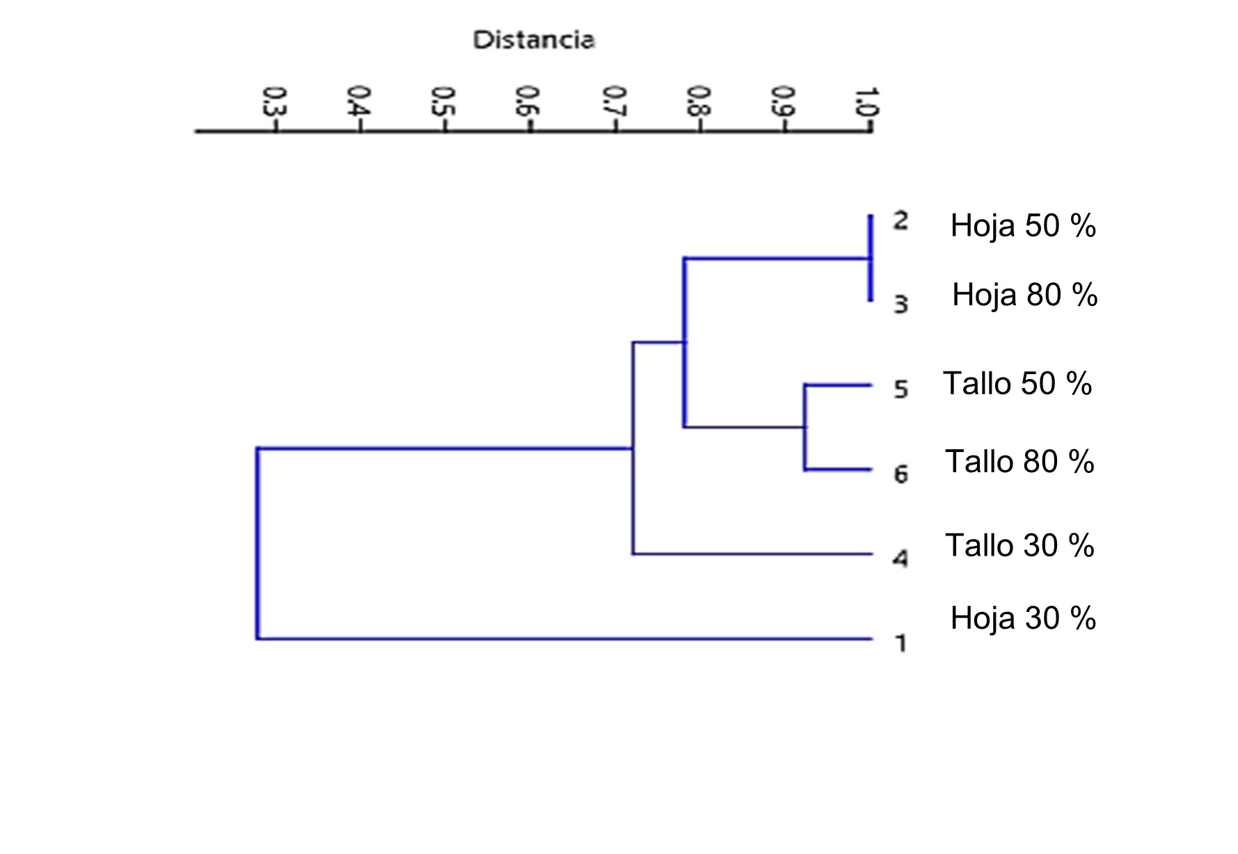 Después de obtener los cromatogramas se efectuó un análisis de presencia (1) y ausencia (0) a los diferentes tiempos de retención (entre 0 y 35 min) en los que los compuestos eluyeron en las seis muestras analizadas. Con la información de presencia/ausencia se elaboró un dendrograma, para analizar el agrupamiento de los compuestos solubilizados al utilizar las tres concentraciones de etanol.