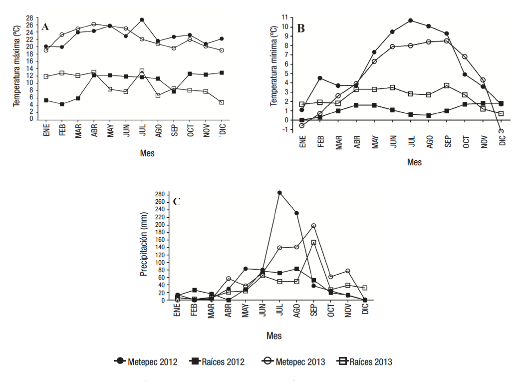 Las dosis de fertilización aplicadas en Raíces fueron 200-300-200 (N-P2O5-K2O; kg·ha-1), 50 kg·ha-1 de micronutrientes y 1 t·ha-1 de gallinaza. En Metepec, las dosis de fertilización fueron iguales, a excepción del P2O5, del que se aplicaron 200 kg·ha-1. Adicionalmente, se aplicaron fungicidas y pesticidas conforme a las necesidades, para controlar las plagas y enfermedades. En la Figura 1, se muestran las temperaturas máximas y mínimas, así como las precipitaciones de cada lugar.