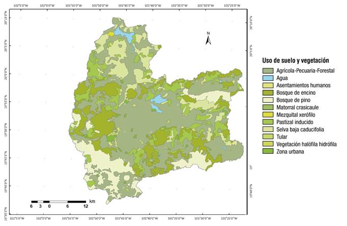 Uso de suelo y vegetación. En la Figura 4 se observa que casi la mitad del suelo de la zona de estudio es de uso agrícola-pecuaria-forestal (44.68 %), mientras que la vegetación halófila hidrófila es la que ocupa la extensión menor (0.01 %) (Cuadro 2).