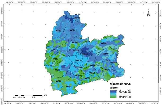 En este estudio, el valor del NC se obtuvo a partir de los datos tabulados por Mockus et al. (2009), con base en el tipo y uso de suelo (Cuadro 3), en combinación con la carta edafológica (Domínguez-Mora et al., 2008). La distribución espacial, de acuerdo con el NC obtenido, se muestra en la Figura 6.