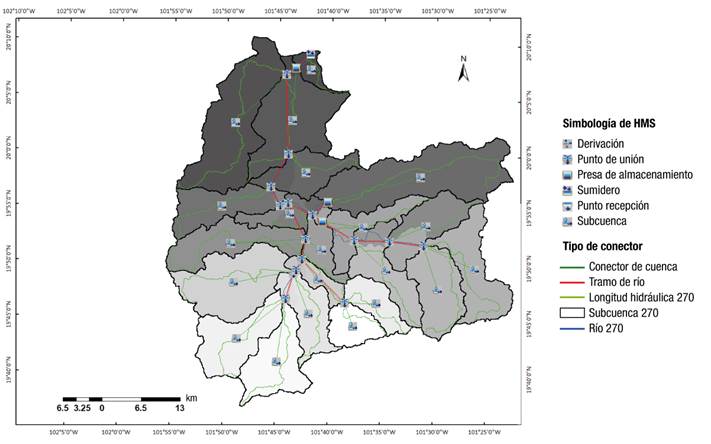 Se realizó un análisis hidrológico para dos escenarios: 1) situación actual (cajas de agua operando) y 2) situación hipotética (cajas para entarquinar suprimidas o en desuso). Dentro del modelo hidrológico, con el programa HEC-HMS, se consideraron las metodologías del Soil Conservation Service (SCS) de los Estados Unidos (número de curva de escurrimiento e hidrograma unitario) y un una tormenta diseño de 167.8 mm. El tránsito de avenidas en cauces se realizó con el método de Muskingum.