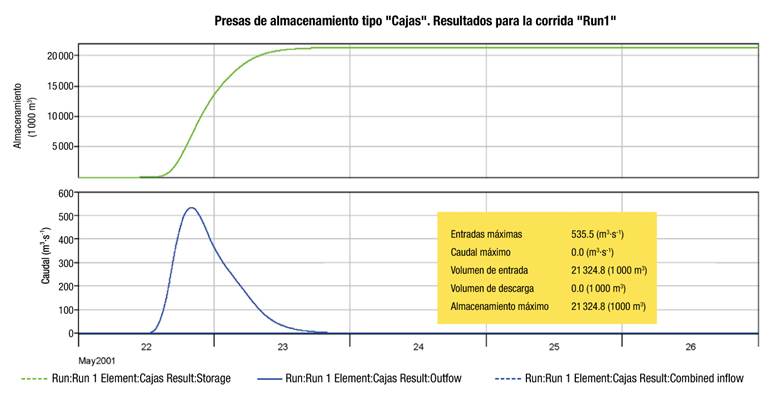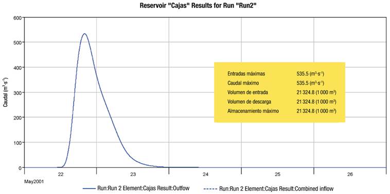 Con la situación actual, el caudal generado a la salida del sistema de cajas fue de 0 m3·s-1, lo cual es producto del almacenamiento parcial del escurrimiento, mientras que con la situación hipotética, el caudal máximo se vuelve de 535.5 m3·s-1.