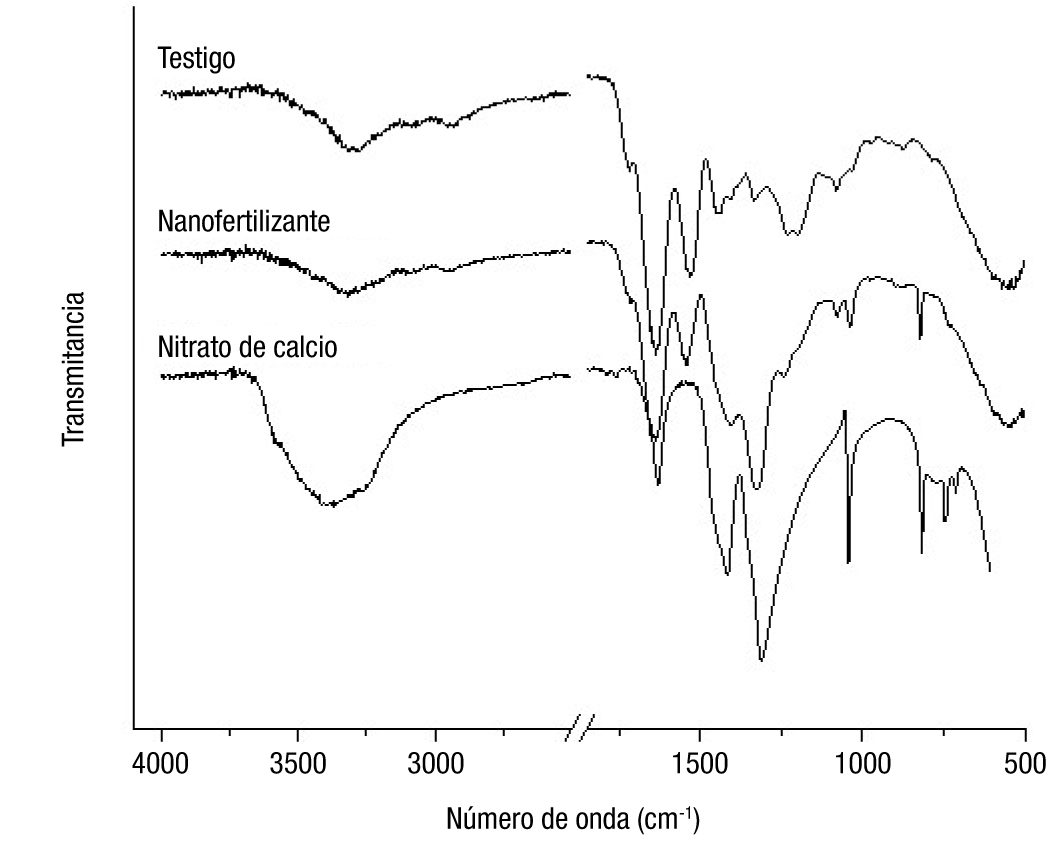 La incorporación del calcio en la gelatina conllevó a cambios identificables en el espectro FTIR del nanofertilizante. El ensanchamiento y desplazamiento de la banda a 1 310 cm-1, y la notable disminución en la intensidad de la banda a 1 415 cm-1 son visibles. Adicionalmente, se observa una disminución en la intensidad de las bandas correspondientes a las amidas I y II de la proteína. Con estos resultados se puede inferir que los iones de Ca2+ fueron adsorbidos por las moléculas de gelatina mediante la coordinación de los iones con los grupos carbonilo (C=O) de la amida.