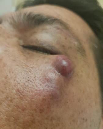A la exploración física presentaba estado general conservado, ECOG 0, Karnofksy 100, lesiones subcutáneas con bordes bien delimitados de consistencia dura en la periferia, en cuyo centro se observaba una coloración rojo-violácea y algunas telangiectasias ubicadas en cara, cuero cabelludo y extremidades superiores (Figuras 1-3), abdomen con masa palpable en hipocondrio derecho ligeramente dolorosa. Estudios de laboratorio con biometría hemática, pruebas de funcionamiento hepático, renal y electrolitos séricos dentro de la normalidad, el examen general de orina reveló proteinuria además de eritrocituria.