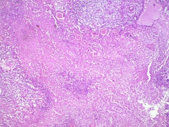 Figura 7 Microfotografía 10x, 100 aumentos. Se observan amplias zonas de necrosis, que denotan mayor proliferación celular y necrosis tumoral por competencia de elementos nutricios