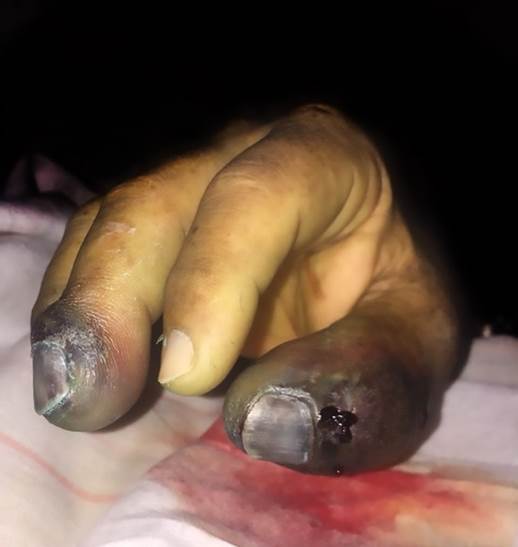 Posteriormente inició terapia blanco con sunitinib dosis 50mg/día durante 3 semanas presentando adecuada respuesta con desaparición de las lesiones dérmicas, posteriormente continuó con 2 semanas de intermitencia durante las cuáles presentó recurrencia de las lesiones en cuero cabelludo por lo que se decidió continuar con terapia blanco a dosis baja continua (37.5mg/día). Sin embargo, el mes siguiente, el paciente presentó deterioro clínico, con cefalea de moderada a gran intensidad y recurrencia de las lesiones dérmicas a nivel de primer y segundo dedo de extremidad superior derecha, ameritando amputación de ambas falanges distales por episodios de sangrado severo a nivel de estas lesiones (Figura 8), se le realizó tomografía de cráneo reportando metástasis cerebrales sin deterioro neurológico aparente. A 3 meses de postoperado el paciente presentó limitación franca para la deambulación, se realizó tomografía de control identificando múltiples metástasis a nivel de tejidos blandos, incluido fémur derecho explicando así la limitación funcional. La evolución del paciente fue tórpida falleciendo a los 5 meses del postoperatorio.