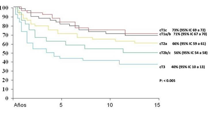 En nuestra serie la sobrevida cáncer específica fue de 95% (95% IC 96 a 98), 90% (95% IC 91 a 93) y 83% (95% IC 83 a 86), a 5, 10 y 15 años respectivamente, similares a las obtenidas por el grupo de Zincke et al.,13 de 90 y 82% a 10 y 15 años respectivamente. La diferencia obtenida a los l0 años puede ser explicada por el hecho de que nuestra serie tiene un porcentaje elevado de pacientes en etapas T3 y la de la Clínica Mayo solo son etapas T2c o menores. Al igual que en nuestra serie, a 15 años de vigilancia, la sobre libre de recurrencia fue también del 40%. Los buenos resultados a largo plazo han sido reportados también por otras series que muestran a 25 años de seguimiento, cifras del 68% 84% y 86% para la sobrevida libre de progresión, sobrevida libre de metástasis y sobrevida cáncer específica respectivamente.14