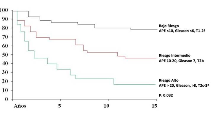 Sobrevida global libre de progresión bioquímica: el 51% estuvieron libres de elevación del ape a 15 años. El 60% a los 10 años y el 72% a los 5 años. La gran mayoría de los que recurrieron ocurió dentro de los primeros 4 años.