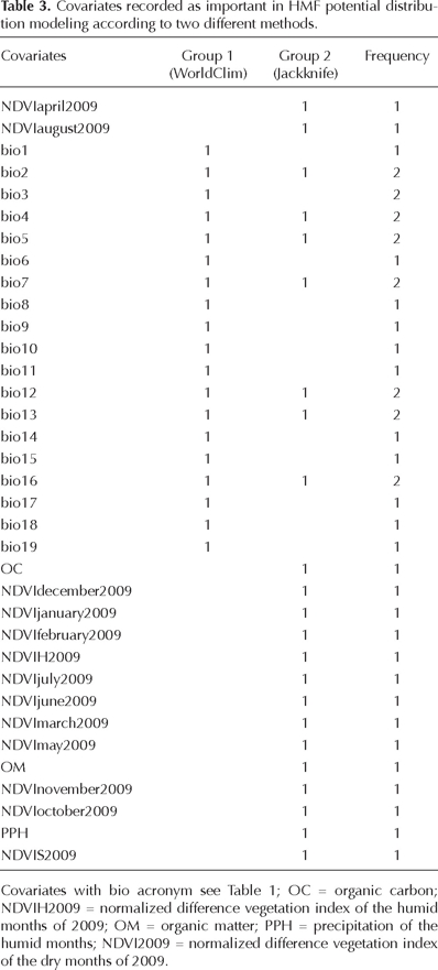 Potential distribution modeling. Modeling of HMF potential distribution was done using two sets of covariates (Table 3). The first used only the 19 WorldClim covariates, and the second selected the covariates based on the following procedure (Yost et al., 2008): (1) MaxEnt (Phillips et al., 2006) was run using the 56 covariates, (2) the gain values were extracted from the Jackknife validation test and a mean test (95% significance level) was applied to determine their confidence intervals, (3) the covariates with values higher than the upper maximum of the confidence interval were selected, and (4) a second MaxEnt analysis was run only using the selected covariates (in step 3).