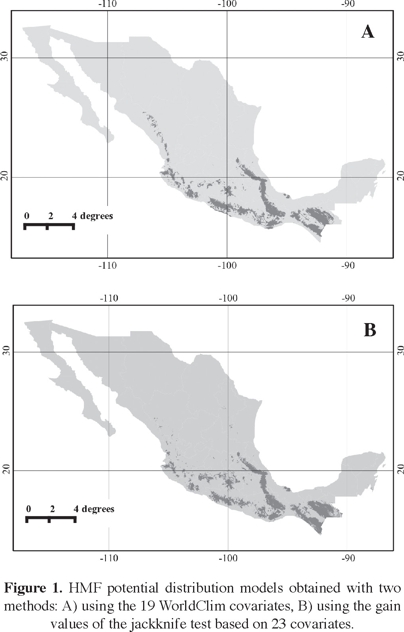 The estimated surface of HMF based on the two modeling methods is quite similar; on average it measures 139,405 km2, which represents about 7% of the Mexican territory. Each model records slight differences, especially in those areas where HMF has not been previously recorded. However, there were no significant differences among accuracy of the maps generated with the covariates used by each of the two methods (Table 4). Based on these results, the potential distribution of HMF is given only with the polygon generated by the Jackknife method (group 2, Figure 1b).