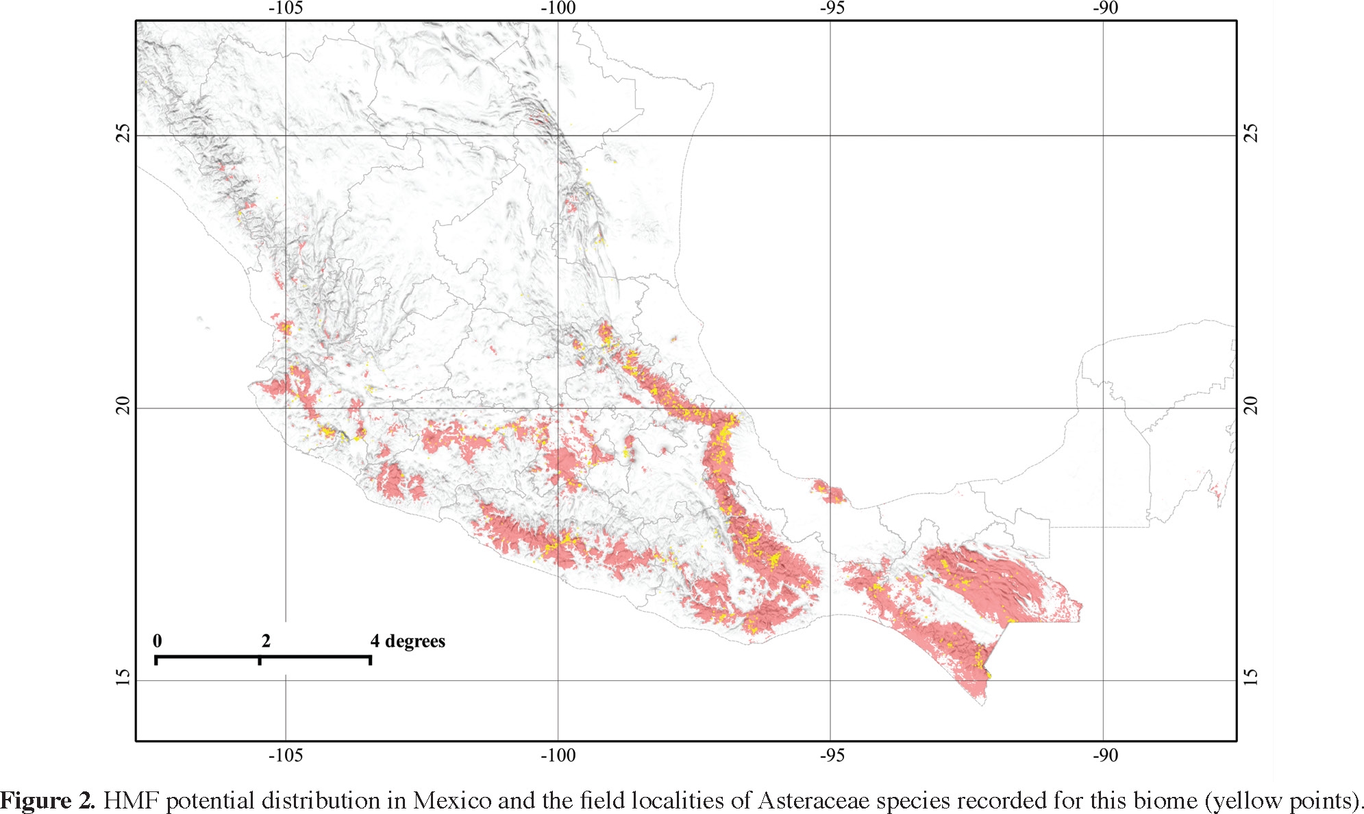 Figure 2 shows that HMF may occur in 25 out of 32 Mexican states. The larger HMF geographical extension was found in four states: Chiapas (30%), Oaxaca (23%), Guerrero (12%), and Michoacán (9%). Additional potential surface (24%) was located in the states of Hidalgo, Jalisco, México, Nayarit, Puebla, and Veracruz and only 2% of HMF potential surface is found in the states of Colima, Distrito Federal, Durango, Guanajuato, Morelos, Nuevo León, Querétaro, San Luis Potosí, Sinaloa, Tabasco, Tamaulipas, Tlaxcala, and Zacatecas. Neither literature nor herbarium vouchers had recorded the occurrence of HMF in Guanajuato, Tabasco, Tlaxcala, or Zacatecas.