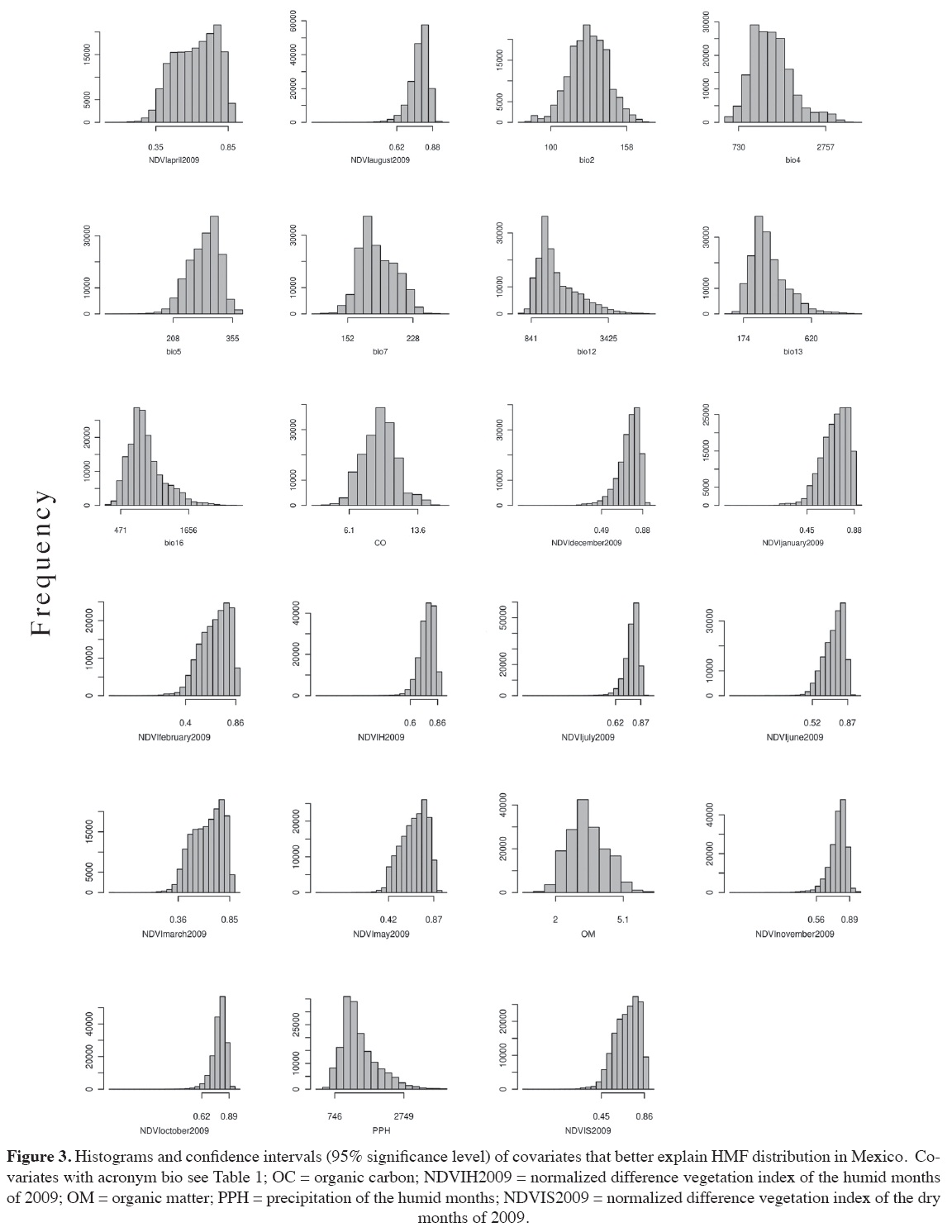Figure 3 shows the histograms with the confidence intervals of the covariates disclosed as important in HMF modeling. From them, 13 were of remote sensing data, eight were climatic, and two were soil properties. The covariates with less than 50% variation among their confidence intervals were the normalized vegetation indices for July (40%), March (42%), August (42%), October (44%), and the set of humid months (43%). Covariates with more than 100% variation among their confidence intervals were the normalized vegetation indices for May (107%), February (115%), and April (143%), the OC (123%), the OM (155%), the precipitation of the wettest quarter (bio16, 252%), the precipitation of the wettest months (bio13, 256%), the precipitation of the humid months (268%), the temperature seasonality (bio4, 278%), and the annual precipitation (bio12, 307%).